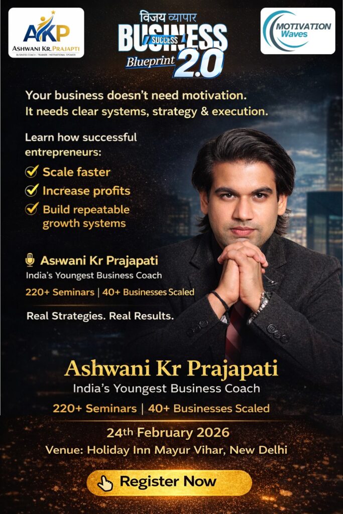 The Vijayi Vyapar workshop will be held on 24 February 2026 at Holiday Inn, Mayur Vihar, New Delhi . It is a full-day, intensive workshop designed to deliver practical business strategies, real-world implementation frameworks, and actionable growth systems , ensuring participants gain maximum value in a single power-packed day.